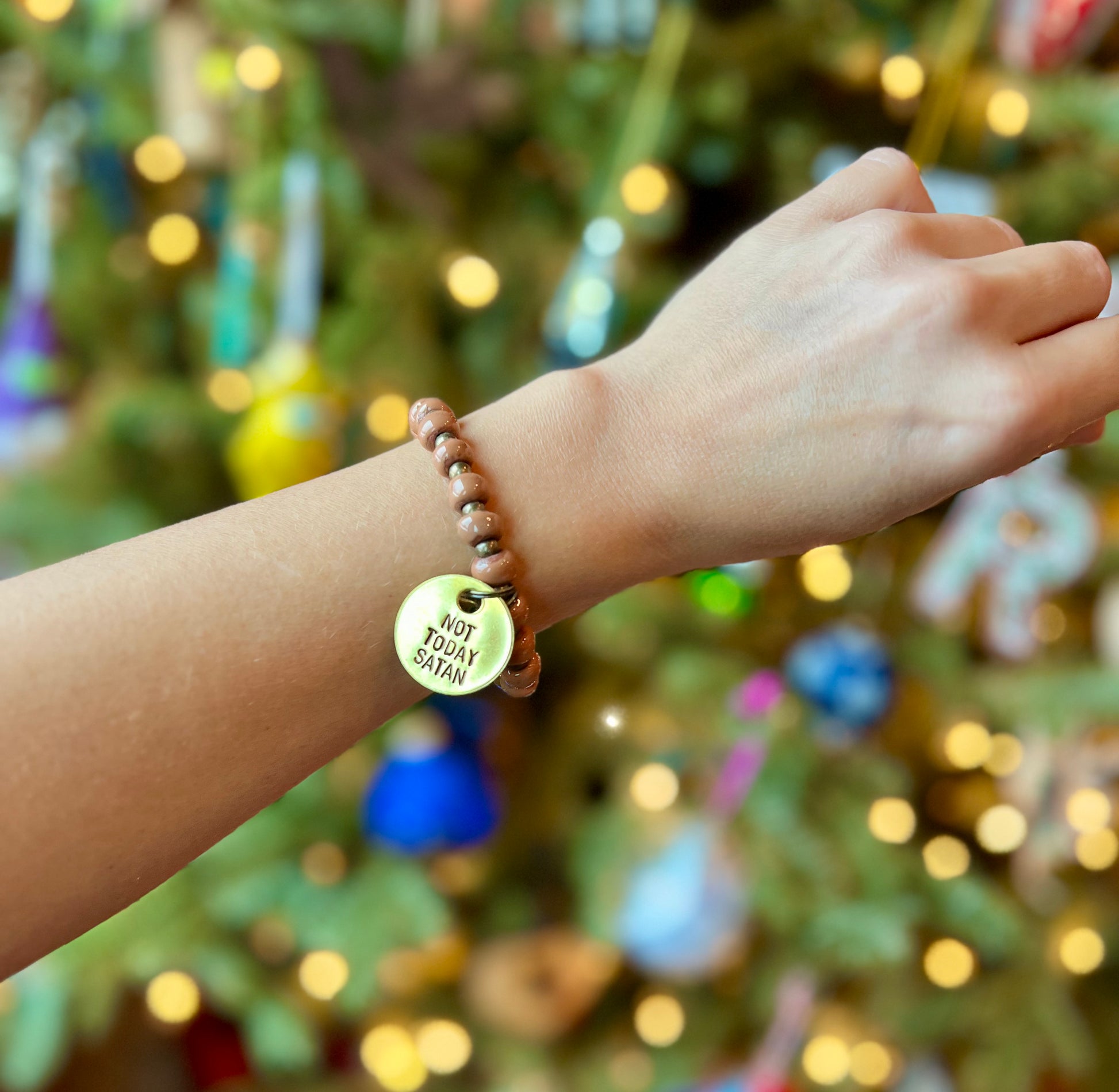 * Handmade in Haiti * Glazed, kiln fired AUBURN clay beads on elastic * Approximately 7” diameter * Antique brass spacer beads * Inspirational antique brass hand-stamped charm {25mm circle} "NOT TODAY SATAN" * Single bracelet listing
