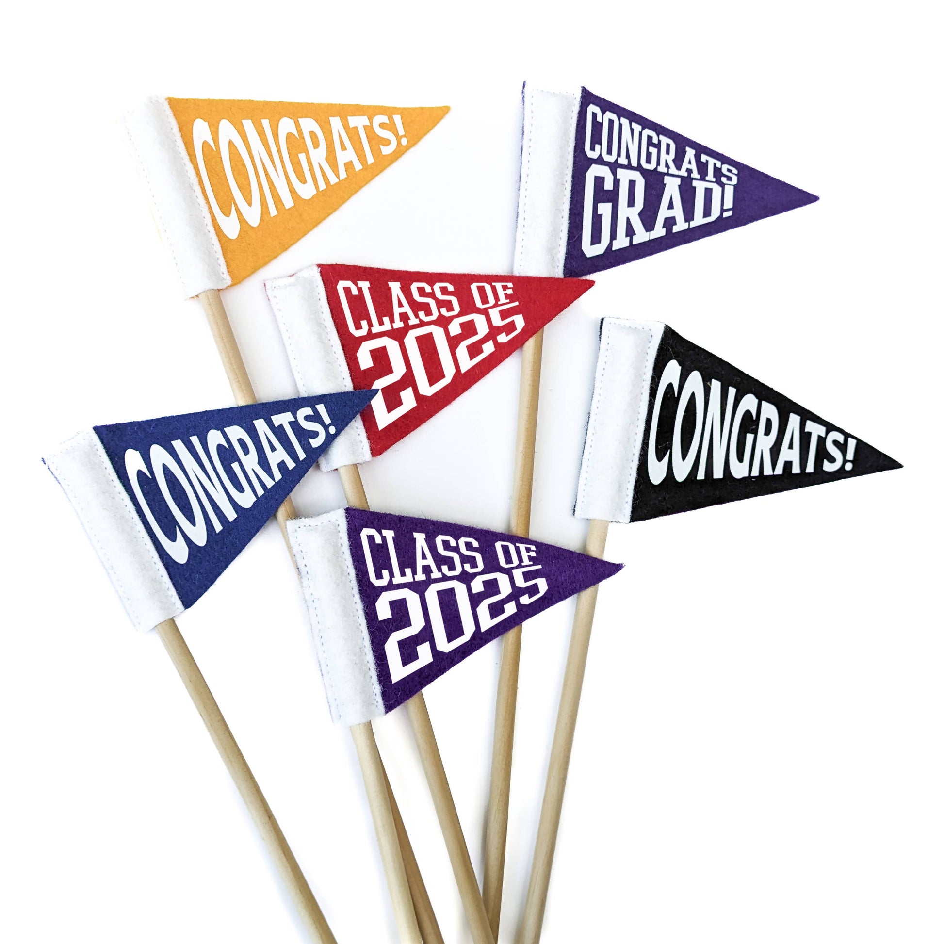 Our tiny message pennants are meticulously crafted in the USA from premium, domestically-sourced wool blend felt. Measuring 2.5 x 4 inches on a 12-inch wooden dowel, these mini flags feature messages to celebrate graduates at this exciting time of year. "Congrats Grad" in black and "Class of 2025" in orange are available as a unique alternative to cards, tags, cake toppers and more. Versatile and compact, they're ideal for adding a touch of fun to bouquets, vases or centerpieces.